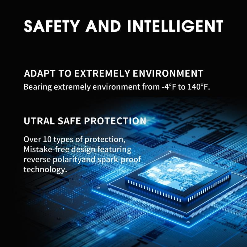 Notre démarreur de voiture est équipé de 10 systèmes de protection (inversion de polarité, charge inversée, décharge excessive, connexion inversée, court-circuit, surcharge, surintensité, surchauffe, protection anti-étincelles, etc.). Ce booster de batterie haute puissance garantit une utilisation sûre et fiable. Il fonctionne dans une plage de températures allant de -22°F à 140°F, assurant des performances stables même dans des conditions climatiques extrêmes.